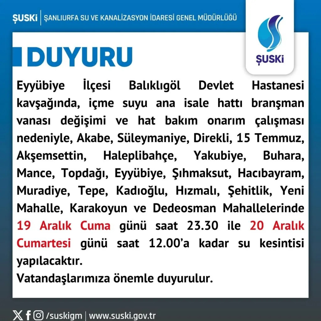 Şanlıurfa Su ve Kanalizasyon İdaresi Genel Müdürlüğü (ŞUSKİ), Eyyübiye ilçesinde yapılacak bakım ve onarım çalışmaları nedeniyle çok sayıda mahallede planlı su kesintisi uygulanacağını duyurdu.