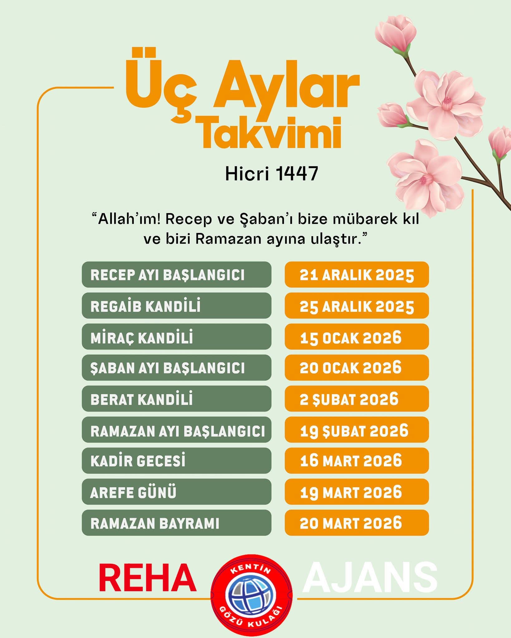 Üç aylar süresince Regaip, Miraç ve Berat kandilleri ile Kadir Gecesi gibi İslam dünyasında büyük önem taşıyan mübarek geceler idrak edilecek. Diyanet İşleri Başkanlığı Vakit Hesaplama Bölümü’nün paylaştığı bilgilere göre, üç ayların başlangıcı Recep ayı ile birlikte gerçekleşiyor.