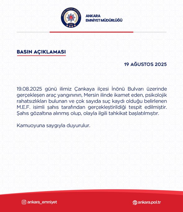 19.08.2025 günü ilimiz Çankaya ilçesi İnönü Bulvarı üzerinde gerçekleşen araç yangınının, Mersin ilinde ikamet eden, psikolojik rahatsızlıkları bulunan ve çok sayıda suç kaydı olduğu belirlenen M.E.F. isimli şahıs tarafından gerçekleştirildiği tespit edilmiştir. Şahıs gözaltına alınmış olup, olayla ilgili tahkikat başlatılmıştır. Kamuoyuna saygıyla duyurulur.