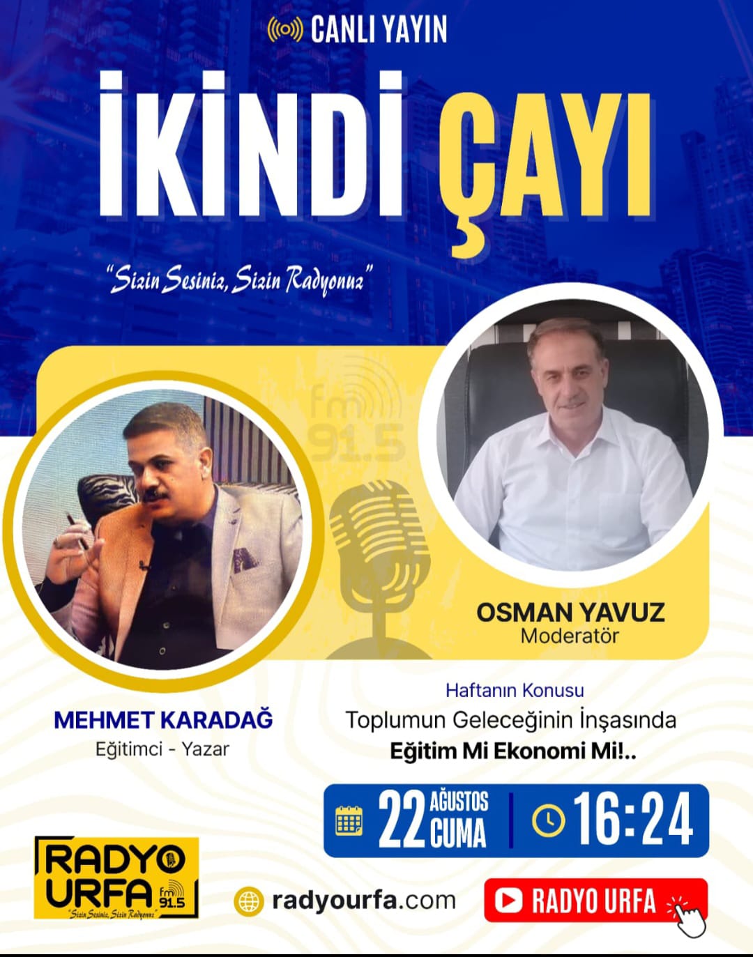 Eğitimci/Yazar Mehmet KARADAĞ, yarın Rafyo Urfa'ya konuk olacak.