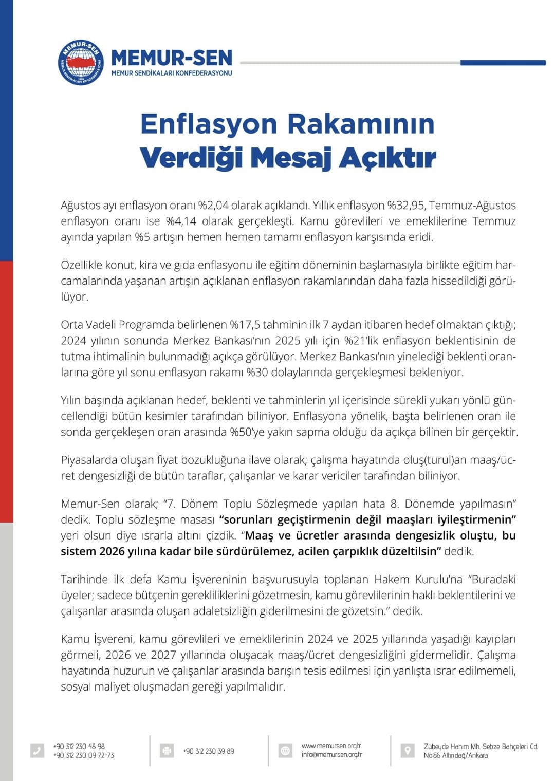 Memur-Sen, Orta Vadeli Program’da belirlenen yüzde 17,5’lik hedefin daha ilk 7 ayda aşıldığını, Merkez Bankası’nın ise 2025 yılı için yüzde 21’in üzerinde enflasyon öngördüğünü vurguladı. Bu durumun çalışanlar için ciddi kayıplar anlamına geldiği ifade edildi.