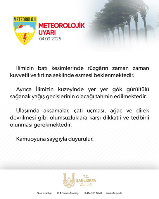 Şanlıurfa Valiliği, Meteoroloji'nin uyarılarının ardından resmi sosyal medya hesabından vatandaşları uyardı. Valilik açıklamasında şu ifadelere yer verildi: