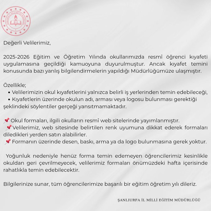 Şanlıurfa İl Milli Eğitim Müdürlüğü, 2025-2026 eğitim-öğretim yılı okul kıyafetleri hakkında velilerin merak ettiği konulara açıklık getirdi. Müdürlük, son günlerde yayılan "okul kıyafetlerinin yalnızca belirli mağazalardan alınabileceği" ve "formaların üzerinde okul logosu bulunmasının zorunlu olduğu" gibi söylentilerin gerçeği yansıtmadığını bildirdi.