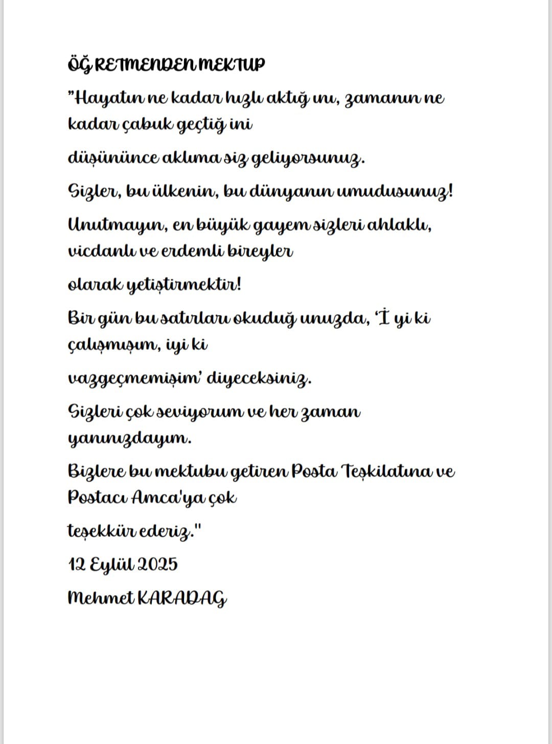 Öğretmenden Mektup etkinliği şu şekilde gerçekleşti. Eğitimci/Yazar Mehmet Karadağ bir mektuba öğrencileri ile ilgili duygularını kaleme aldı. Anlamlı ve dokunaklı mektupta şu ifadeler yer alıyordu.