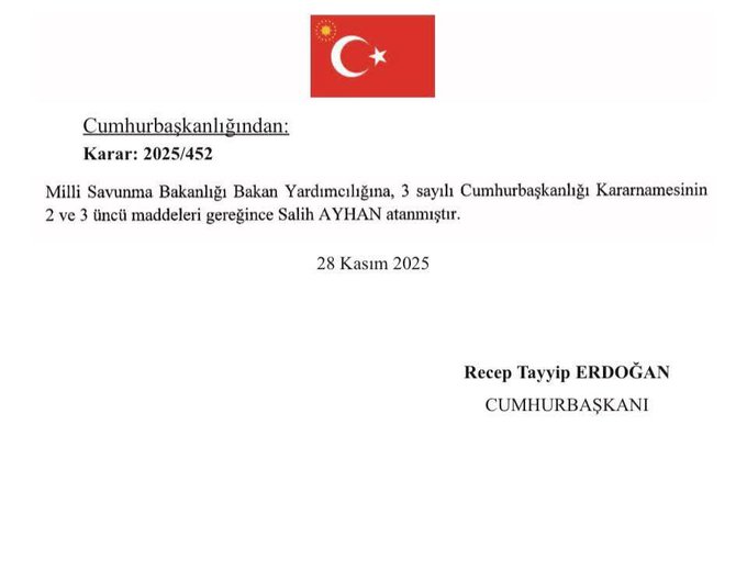Cumhurbaşkanı Recep Tayyip Erdoğan’ın imzasıyla yayımlanan atama kararları, Resmi Gazete’nin 29 Kasım 2025 tarihli 33092 sayılı sayısında duyuruldu. Kararlara göre, 2022-2023 yıllarında Şanlıurfa Valisi olarak görev yapan Salih Ayhan, Milli Savunma Bakanlığı Bakan Yardımcılığı görevine getirildi.